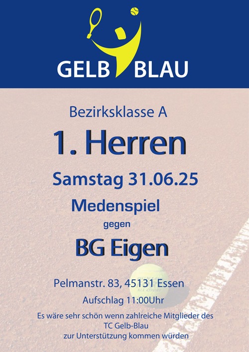 Am Samstag, den 31.05. um 11 Uhr, steht bereits das vierte Medenspiel der Saison für unsere Herren 1 vom Essener TC Gelb-Blau an. Wir freuen uns, erneut auf heimischer Anlage aufschlagen zu dürfen – dieses Mal gegen die Mannschaft von Blau-Gelb Eigen 1 aus Bottrop.
